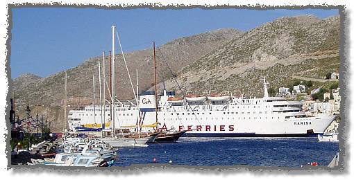 Vor allem wenn das Linienschiff Rhodos – Piräus anlegt und halb Symi auf den Beinen ist. Die dicke Fähre sprengt fast den Hafen, kaum zu glauben dass sie auf diesem kleinen Fleckchen manövrieren kann. Zum Glück pustet heute wenig Wind durch die Senke. Aber die griechischen Kapitäne sind perfekt und einiges gewohnt. Die beiden Heckleinen werden übergeworfen, die Ausstiegsklappe heruntergelassen und schon kann das Schauspiel beginnen: der Lebensmittelhändler holt das bestellte Gemüse ab, der Bauarbeiter schleppt seine Zementsäcke, ein Caterpillar holt Paletten von Getränken aus dem Bauch des Schiffes, ein paar junge Burschen mit kurzem Haarschnitt klettern in einen Militärjeep und Oma erwartet ihre Enkel... Rush-hour auf Symi.